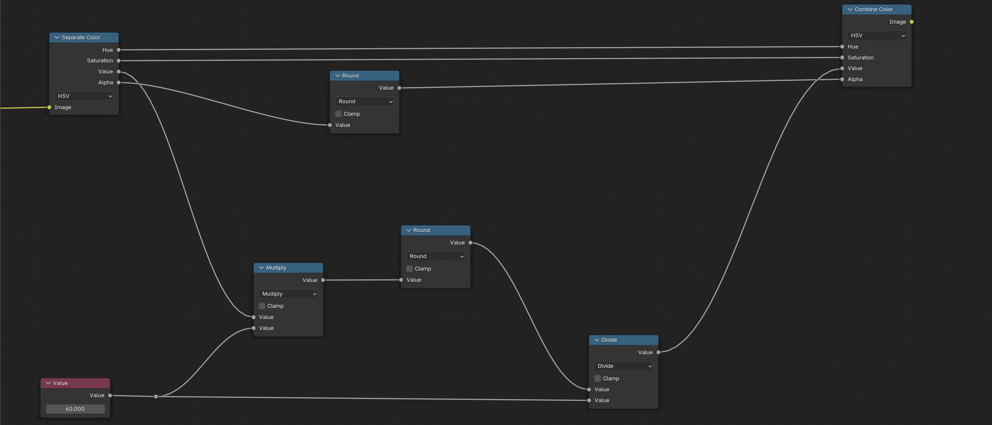What’s happening here: In this section, we’re breaking down the image into its color components using HSV (Hue, Saturation, Value). The math operations we apply help round and quantize the image’s brightness, giving us more control over the pixel art effect. This quantization will make colors appear more distinct and less blended.
